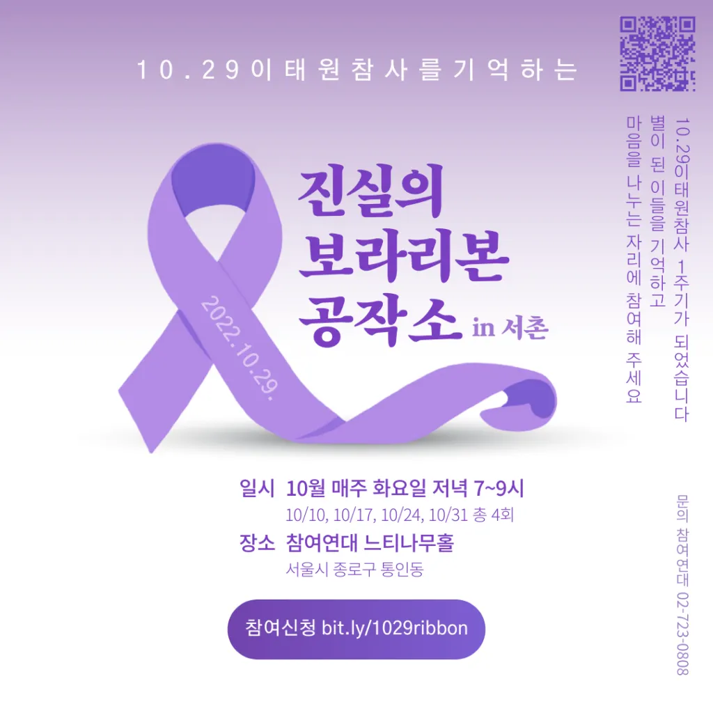 진실의 보라리본을 함께 만드는 보라리본공작소를 10월 한달간 운영합니다.