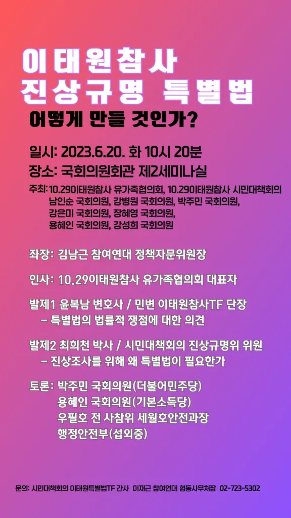 10.29이태원참사 유가족협의회와 10.29이태원참사 시민대책회의는 6월 20일, 국회의원회관 제2세미나실에서 남인순 국회의원, 강병원 국회의원, 박주민 국회의원, 강은미 국회의원, 장혜영 국회의원, 용혜인 국회의원, 강성희 국회의원과 공동으로 [이태원참사 진상규명 특별법 어떻게 만들 것인가?] 토론회를 주최했다. 이날 토론회를 통해, ‘10·29이태원참사 피해자 권리보장과 진상규명 및 재발방지를 위한 특별법안‘(이하 특별법)의 필요성을 살펴보고, 특별법의 제정을 다시 한 번 촉구했다.