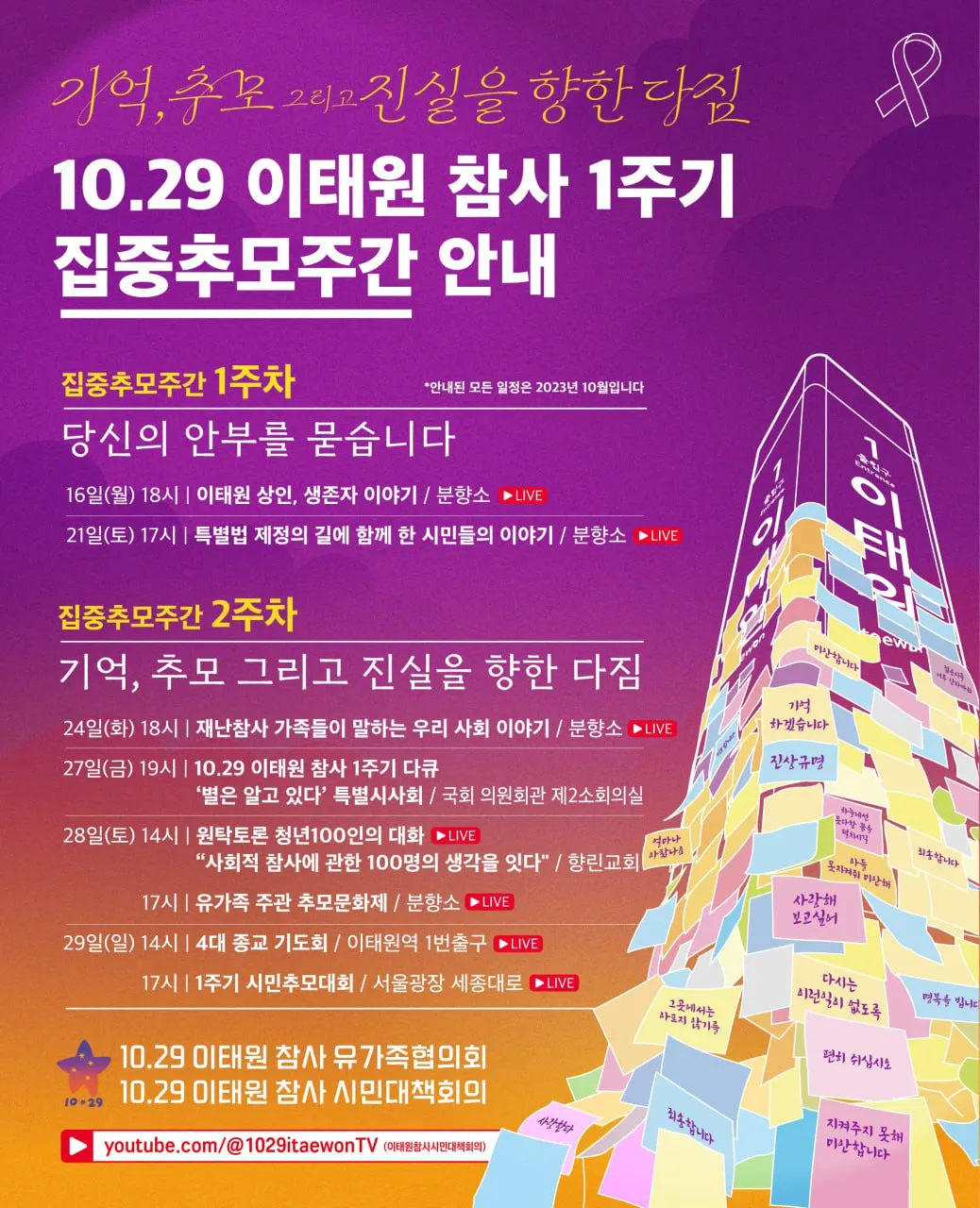 10. 29 이태원 참사 유가족협의회와 10. 29 이태원 참사 시민대책회의는 오는 10월 29일 참사 1주기를 앞두고 집중추모주간(2023. 10. 16. ~ 10. 29.)을 선포하고 이태원역 1번출구 기억과 안전의 길 조성, 사회적 참사의 진실 규명을 위한 투쟁과 공동체 회복의 과제 관련 학술대회, 1년 동안의 유가족 활동을 담은 다큐 ‘별은 알고 있다’ 시사회, 서울광장 분향소와 이태원 일대를 중심으로 한 추모제 등 각종 기억·추모 활동을 이어갈 예정입니다.