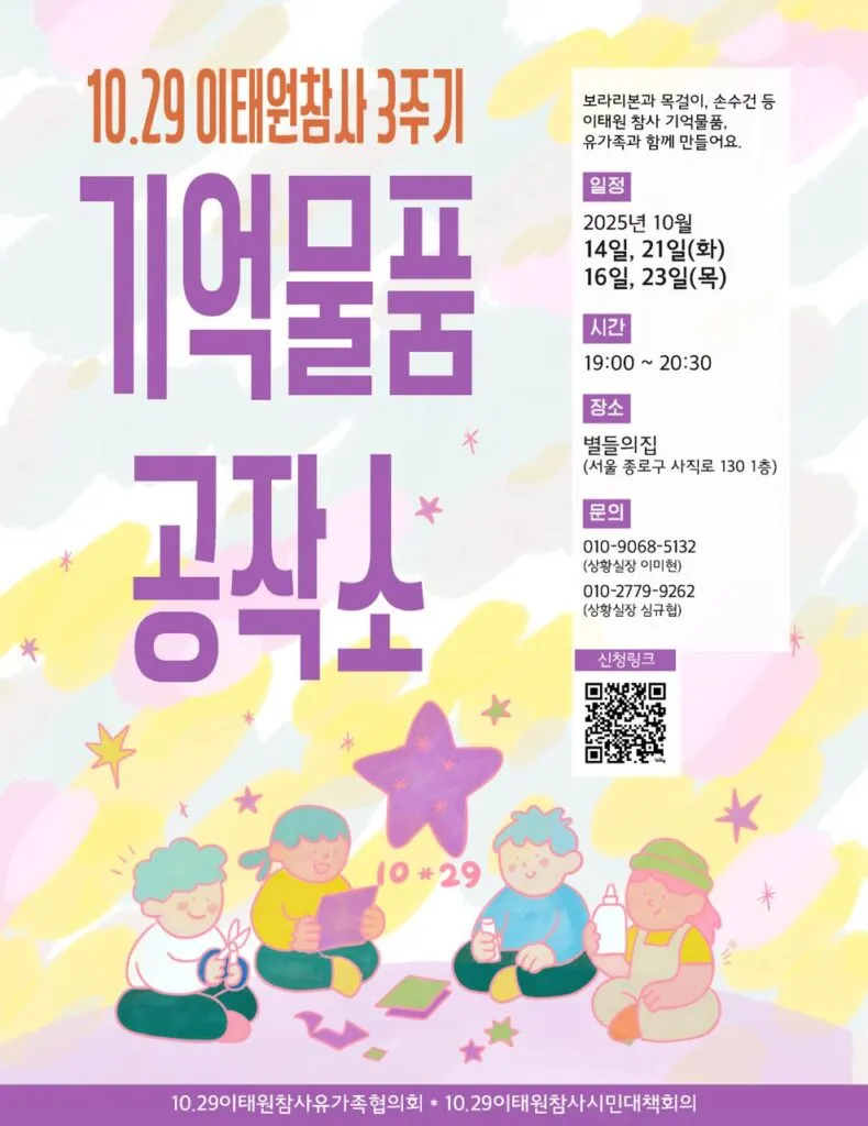 3주기를 앞두고 기억소통공간 별들의집을 방문하거나 추모의 뜻을 보내주시는 분들과 나눌 기억물품이 많이 필요합니다. 유가족과 함께 진실의 별목걸이와 보라리본, 손수건을 만드는 활동에 함께 해주세요.
