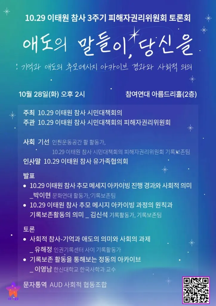 10.29 이태원 참사 3주기,추모메시지 아카이브에 대한 사회적 의의 토론회 및 낭독회 개최