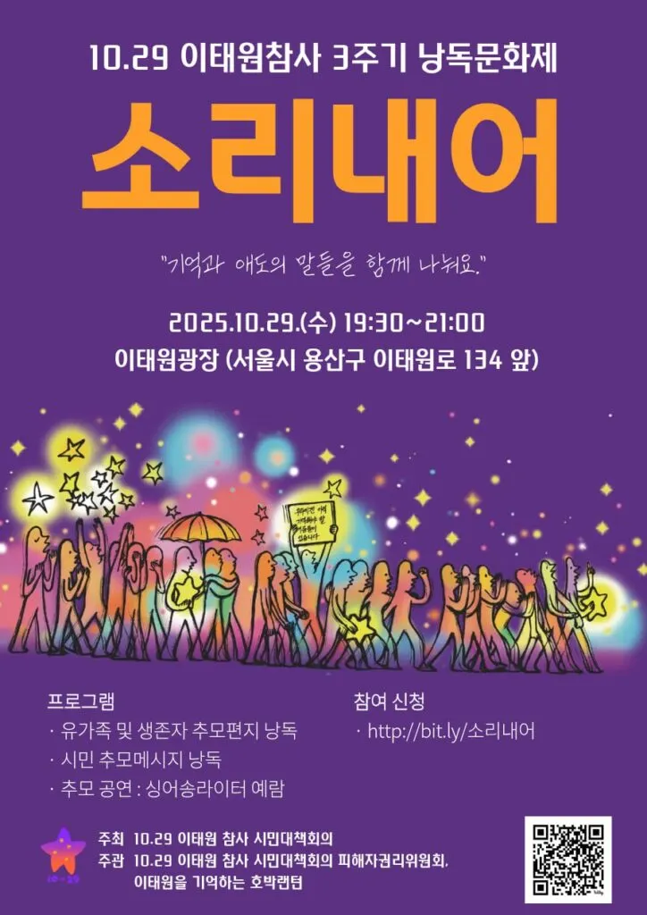 이어서 참사 3주기 당일인 10월 29일 수요일 저녁 7시 30분에 이태원에서는 유가족, 생존자, 구조자와 함께 여는 추모메시지 낭독문화제를 ‘소리 내어’를 개최합니다. 낭독문화제에서 시민들과 이태원 기억 담기를 통해 수집한 기억과 추모의 말들을 함께 소리 내어 읽습니다. 유가족과 생존자의 추모 발언과 추모 공연 그리고 시민들의 몫소리로 읽는 낭독 순서로 진행됩니다.