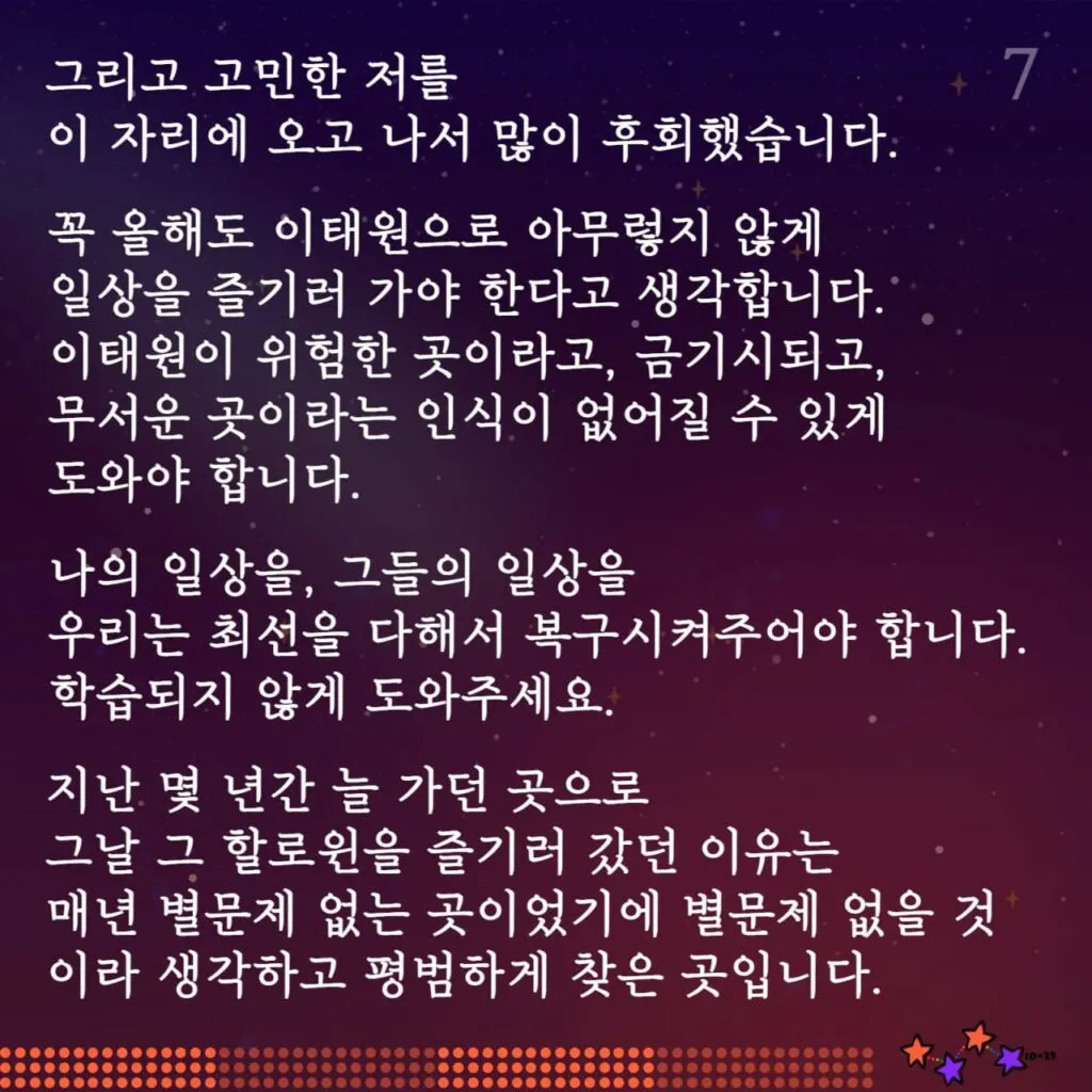 꼭 올해도 이태원으로 아무렇지 않게 일상을 즐기러 가야 한다고 생각합니다.이태원이 위험한 곳이라고 금기시되고,무서운 곳이라는 인식이 없어질 수 있게 도와야 합니다.나의 일상을, 그들의 일상을 우리는 최선을 다해서 복구시켜줘야 합니다.학습되지 않게 도와주세요.