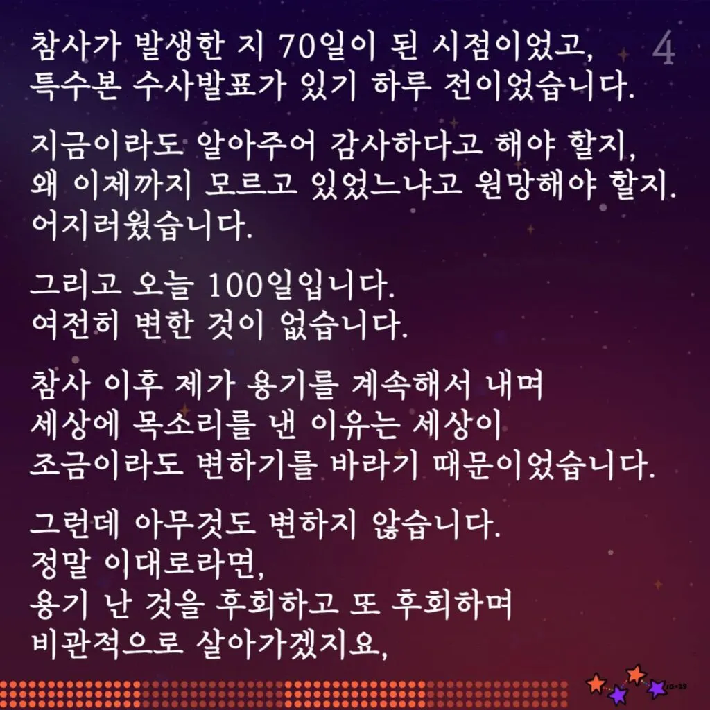 참사 이후 제가 용기를 계속해서 내며 세상에 목소리를 낸 이유는세상이 조금이라도 변하기를 바랐기 때문이었습니다.그런데 아무것도 변하지 않습니다.정말 이대로라면, 용기를 낸 것을 후회하고또 후회하며 비관적으로 살아가겠지요.용기를 낸 대가가, 아무것도 변하지 않는 것을 목격하는 것뿐이라면저는 정말이지 다시는 용기를 내지 못할 것 같습니다.오늘 나오면서도 절망과 희망을 동시에 안고 가까스로 나왔습니다.용기를 내기가 정말 어려운 나라입니다.