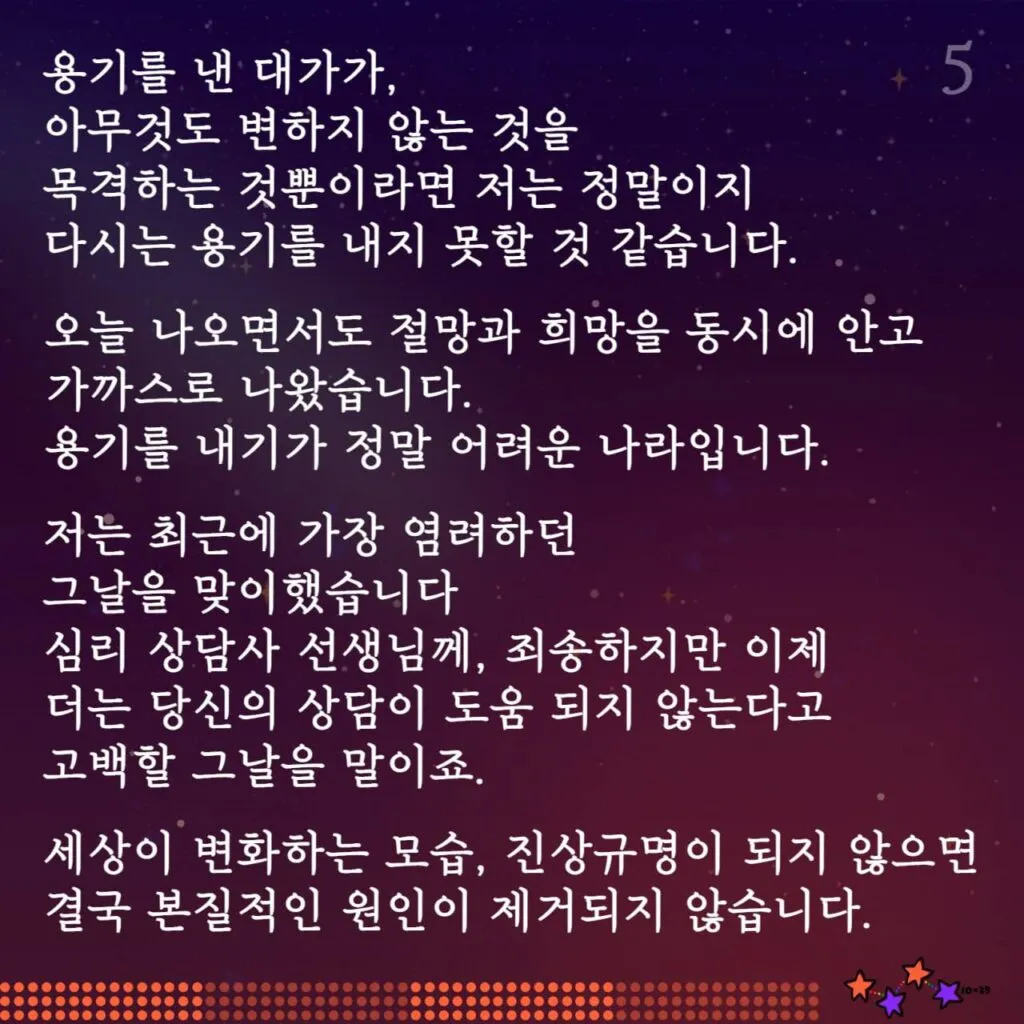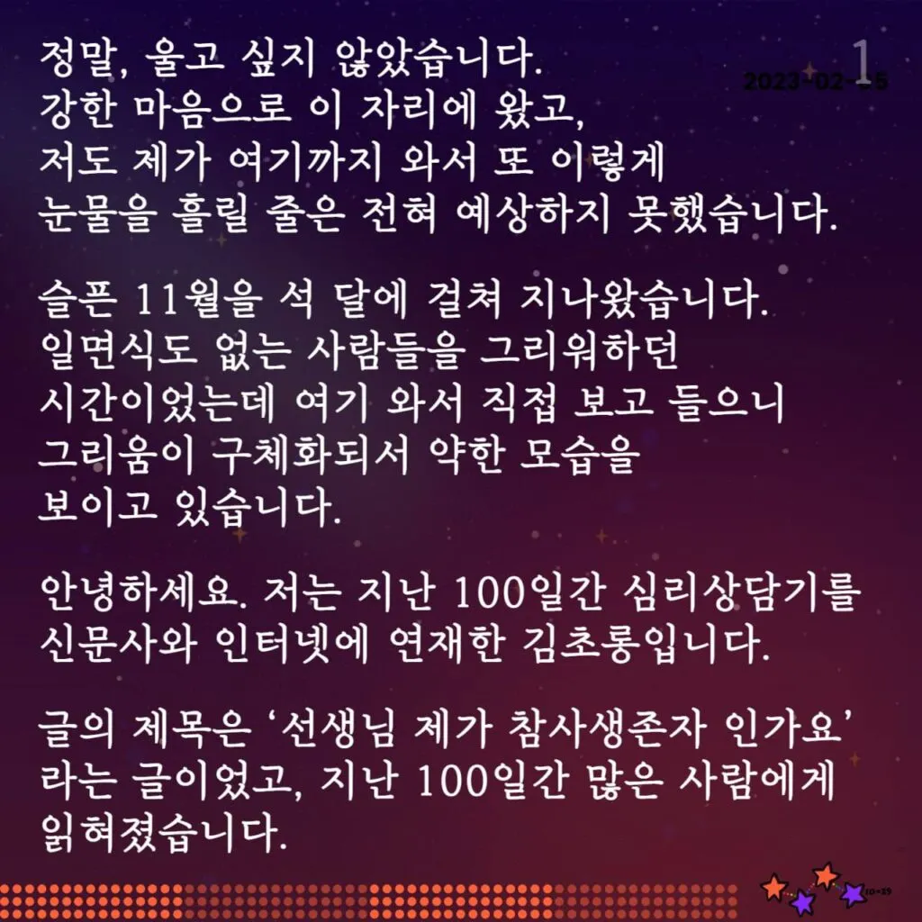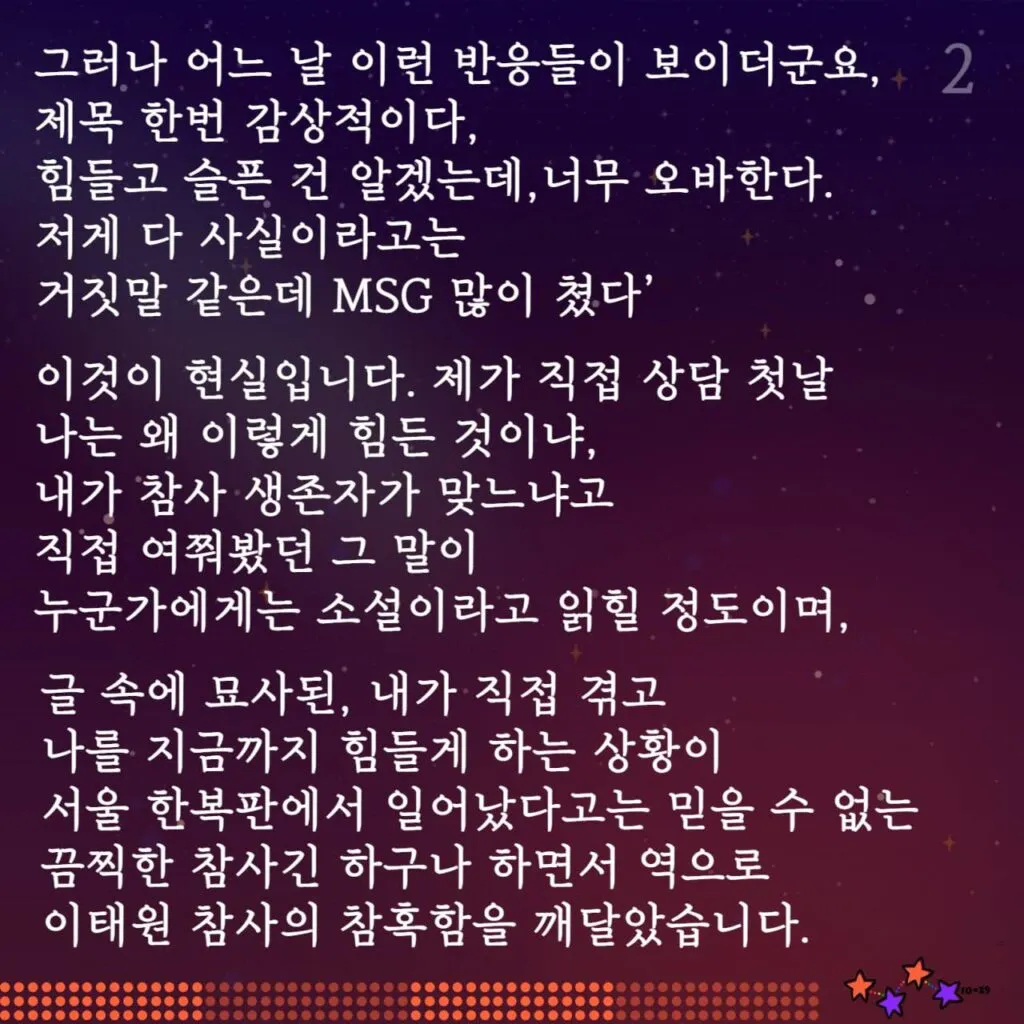 이것이 현실입니다.상담 첫날, ‘나는 왜 이렇게 힘드냐, 내가 참사 생존자가 맞느냐’고선생님께 직접 여쭤봤던 그 말이누군가에게는 소설이라고 읽힐 정도인가 봅니다.