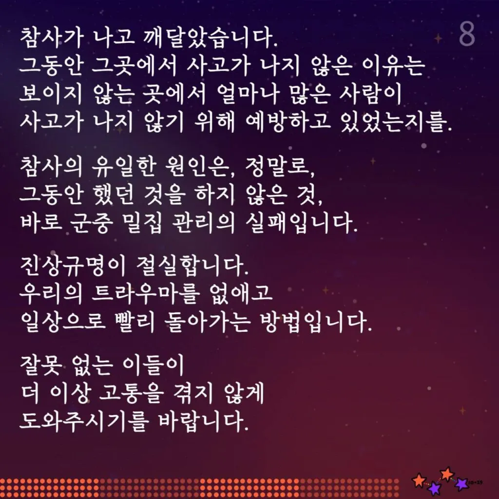 이태원으로 핼러윈을 즐기러 갔던 이유는매년 별 문제 없는 곳이었기에,이번에도 별 문제 없을 것이라 생각했기 때문입니다.참사가 일어나고 깨달았습니다.그동안 그곳에서 사고가 나지 않은 이유는보이지 않는 곳에서 많은 사람들이사고가 나지 않기 위해 예방했기 때문이라는 것을요.