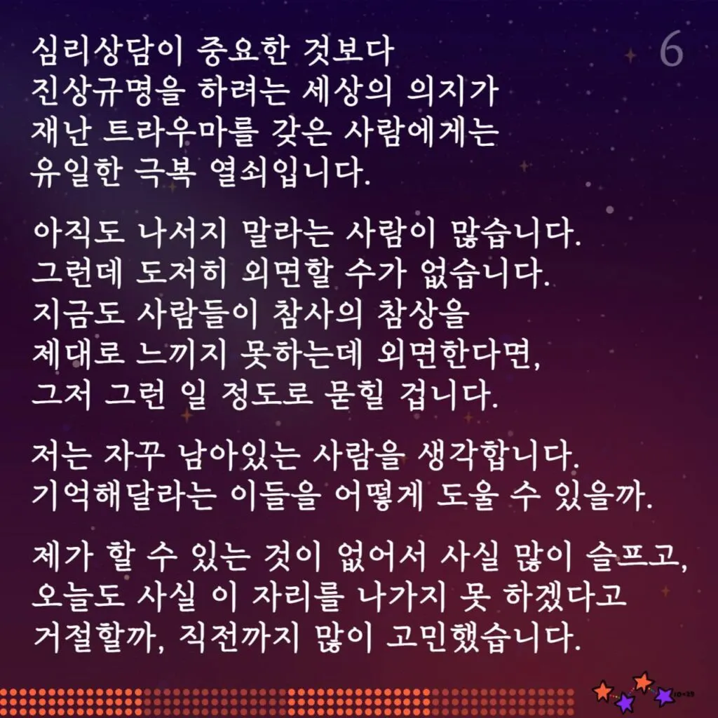 세상이 변화하는 모습을 보지 못하고,진상규명이 되지 않으면 결국 본질적인 원인이 제거되지 않습니다.진상규명을 하려는 세상의 의지가재난 트라우마를 갖은 사람에게는 유일한 극복의 열쇠입니다.