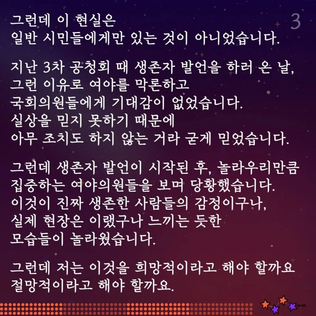 그런데 이 현실은 일반 시민들에게만 있는 것이 아니었습니다.지난 2차 공청회 때 생존자 발언을 하러 국회에 온 날(1월 12일),여야를 막론하고 국회의원들에게 기대감이 없었습니다.실상을 믿지 못하기 때문에 아무 조치도 하지 않는 거라 굳게 믿었습니다.