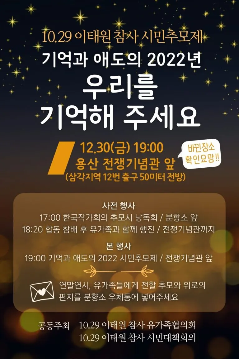 문의 : 10.29 이태원 참사 시민대책회의 (공동상황실장 심규협 010-2779-9262 / 이미현 010-9068-5132)