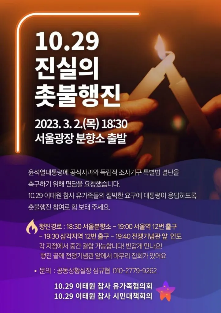 일시·장소 : 2023. 3. 2.(목) 오후 6시 34분, 서울광장 분향소 출발경로 : 서울광장 분향소 – 서울역 – 삼각지역 – 전쟁기념관 앞