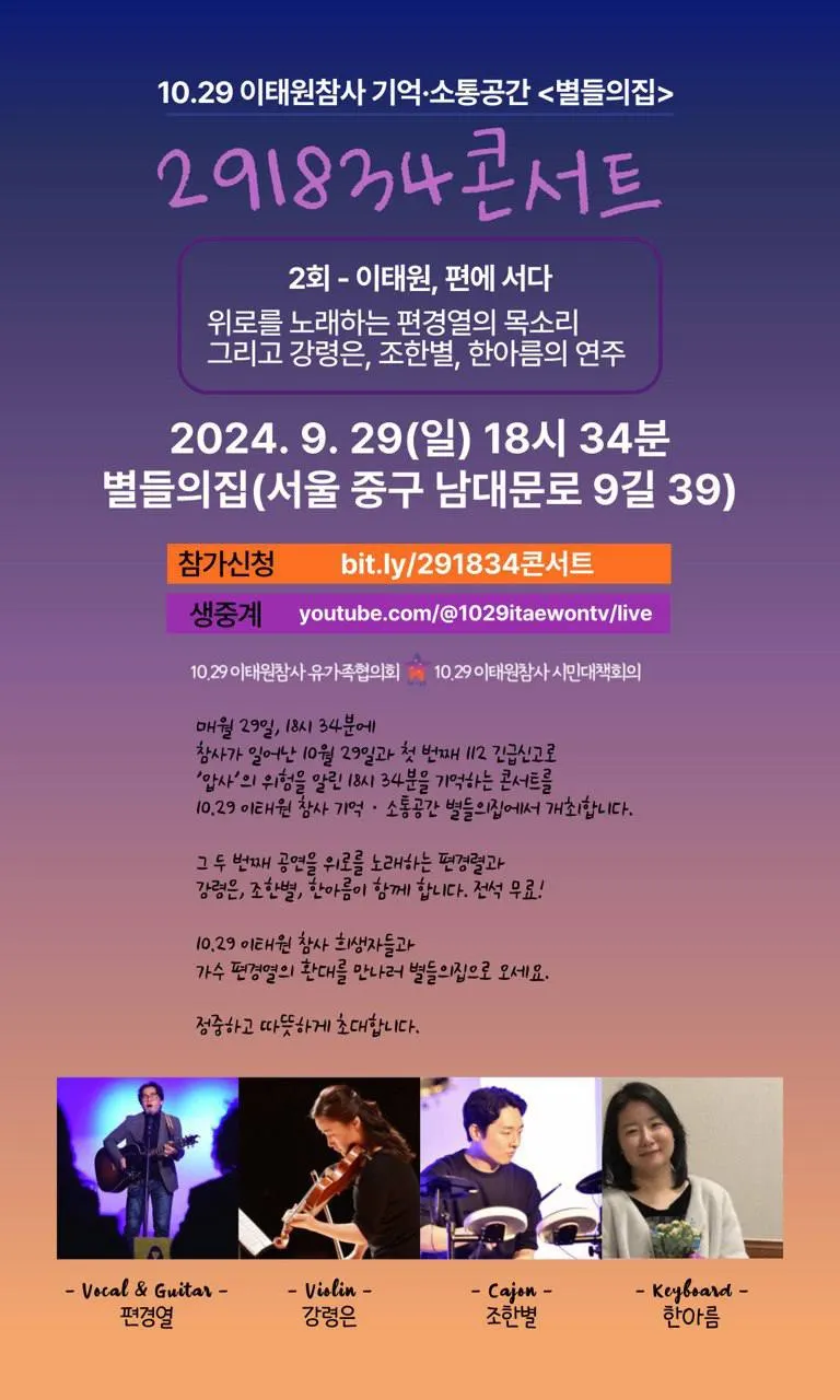 매월 29일, 18시 34분 참사가 일어난 10월 29일과 첫 번째 112 긴급신고로 ‘압사’의 위험을 알린 18시 34분을 기억하는 콘서트를 10.29 이태원 참사 기억·소통공간 별들의집에서 개최합니다.