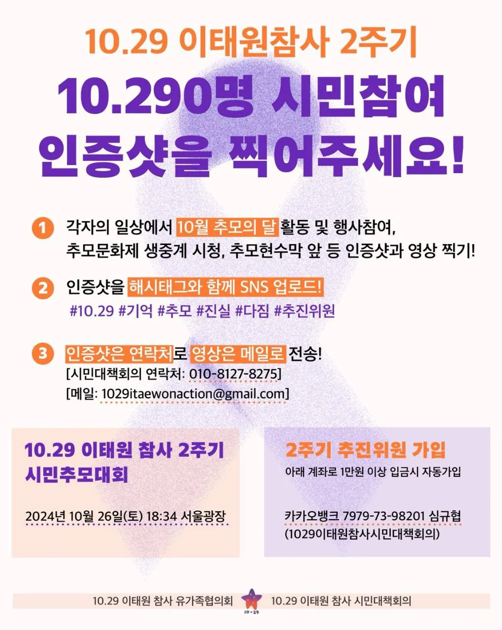 10,290명 시민들이 참여하여 각자의 일상에서 10월 추모의달 활동 및 행사참여 등 인증샷과 영상을 찍어주세요. 인증샷을 해시태그와 함께 SNS업로드(#이태원참사, #진상규명 #기억하겠습니다)하고 시민대책회의에도 보내주세요. (010-8127-8275, 1029itaewonaction@gmail.com)