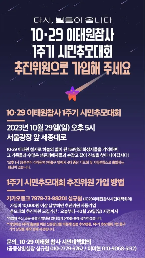 추진위원 가입비 10,000원 이상을 <카카오뱅크 7979-73-98201 심규협(1029이태원참사시민대책회의)> 계좌로 보내시면 자동으로 추모대회 추진위원으로 가입됩니다. 추진위원 가입은 10월 29일(일) 마감되고 추진위원 가입해 주신 모든 분들의 명단은 인터넷과 SNS를 통해 공개하겠습니다.